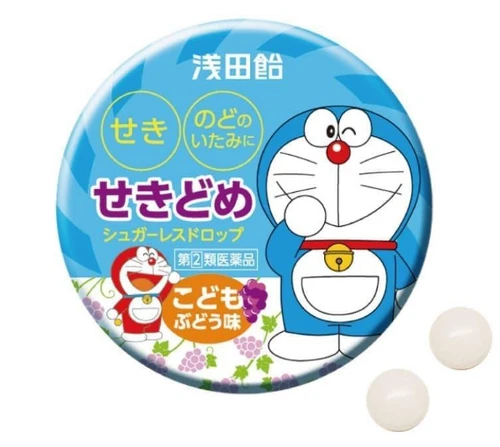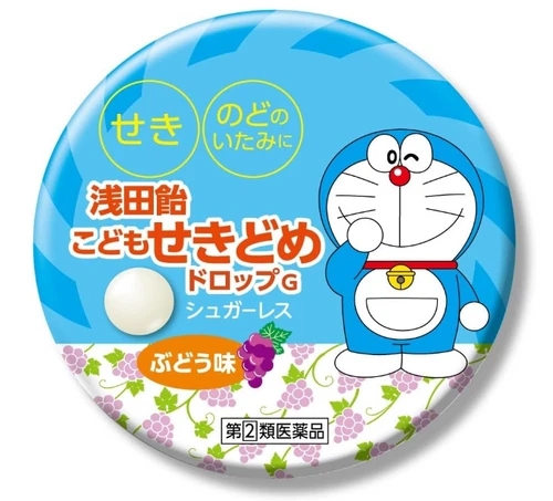 浅田飴子供せきどめドロップ;是一種有效成分包括dl-メチルエフェドリン塩酸塩等三種成分的鎮咳去痰藥,適用於嚴重的咳嗽、痰和喉嚨痛。這種無糖口含錠適合那些關注卡路里和糖分攝取的人。它是一種葡萄口味的藥物,不含薄荷,適合不擅長苦藥的孩子服用,是一種甘美口服的良藥。